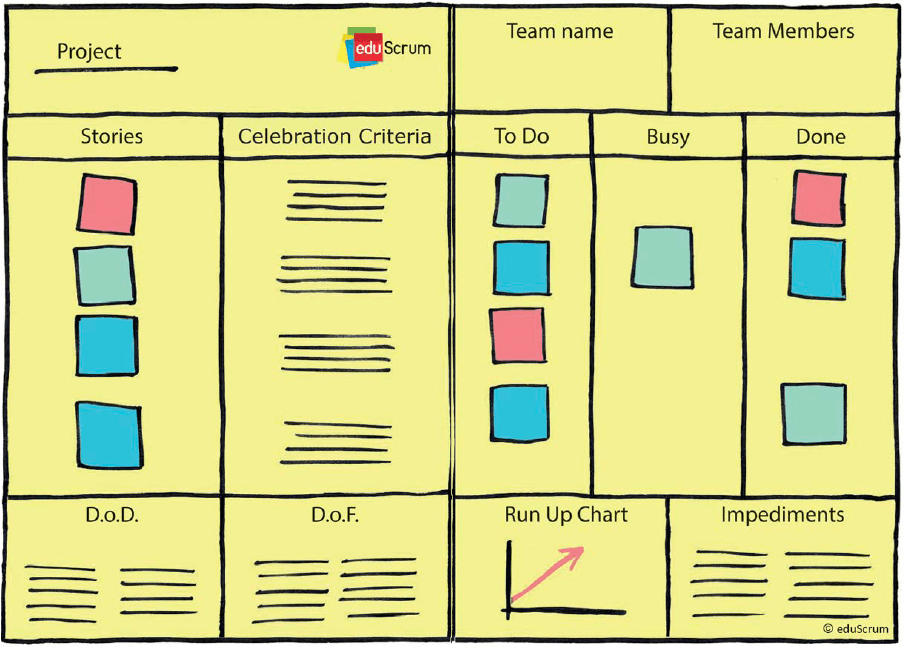 The board below shows how eduScrum monitors project-based learning. You can find such a board in its web-based form implemented in Miro: