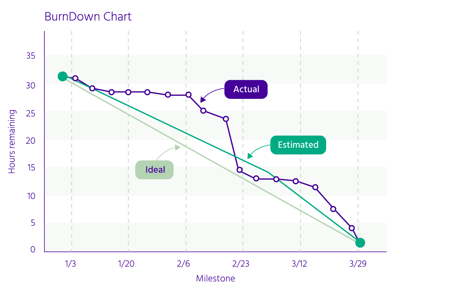 A BurnDown chart illustrates the remaining work over time, helping to ensure goals are met within set timeframes.