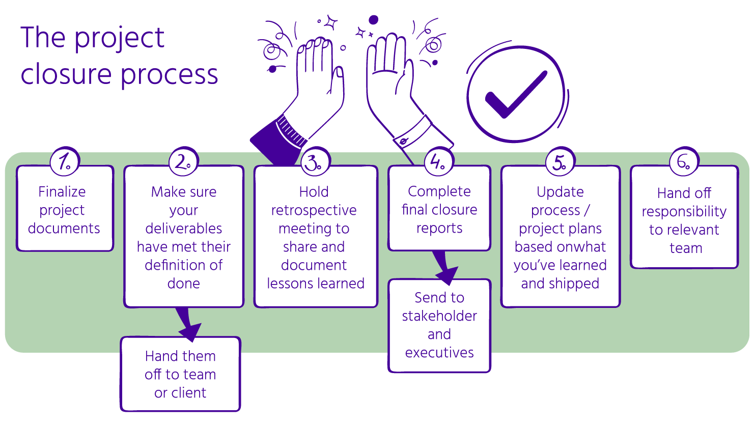 <figure><img src="https://3286121452-files.gitbook.io/~/files/v0/b/gitbook-x-prod.appspot.com/o/spaces%2FYWzVX8R8T6klY40zIavG%2Fuploads%2FKk5k3HnClRw4oevkVoxX%2FAgileXR_GitBook_Visual%2037%402x.png?alt=media&#x26;token=15d912e1-4283-4ea0-b770-fd0f4e384268" alt=""><figcaption><p>The project closure process</p></figcaption></figure>